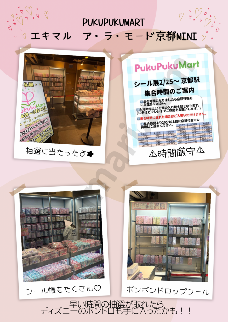 事前にネットで抽選(お店に入って購入する権利の抽選)に応募し、当たったのでPukuPuku Mart 京都にてボンボンドロップシールを購入することができました。
